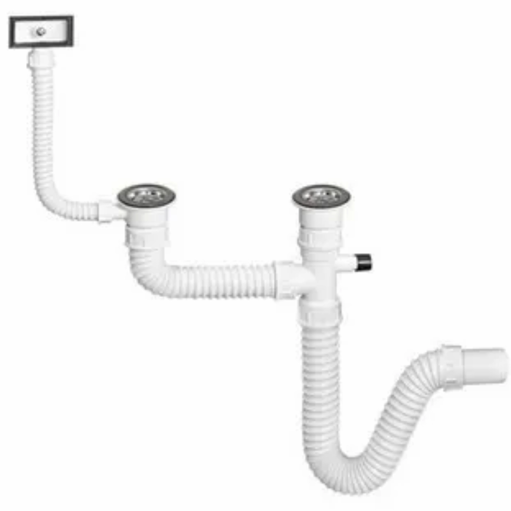 Fleksibilni sifon sudopere sa prelivom i priključkom za mašinu za sudove, koristi se za ugradnju u dvodelne sudopere sa otvorom Ø90 koje imaju preliv ili odvod za oceđivanje posuđa.Izrađen od savitljive PVC cevi prečnika 40 i 20 mm, iznutra potpuno glatka, spolja spiralno motana.